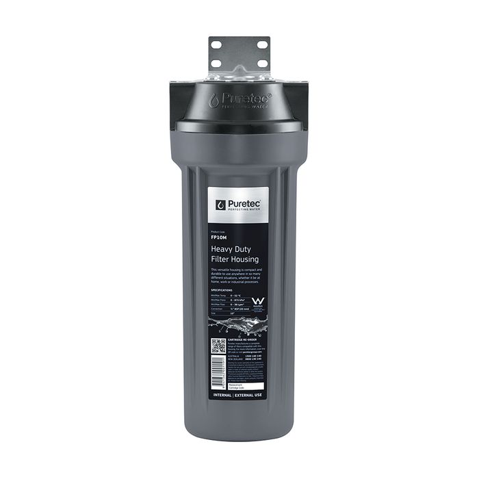 Premium filter housing with Black top and Grey casing and Stainless steel mounts. 10year Warranty and max pressure 875 kpa sets it apart from many other housings. Takes a large range of standard sized Filters cartriges in the 10" x 2 inch ( 250mm x50mm ) range. 20mm inlet/ outlet and max flow 38 ltrs per minute ( depending on cartridge) suits many situations but often a larger housing is required for water flow or longer capacity before blocking up...